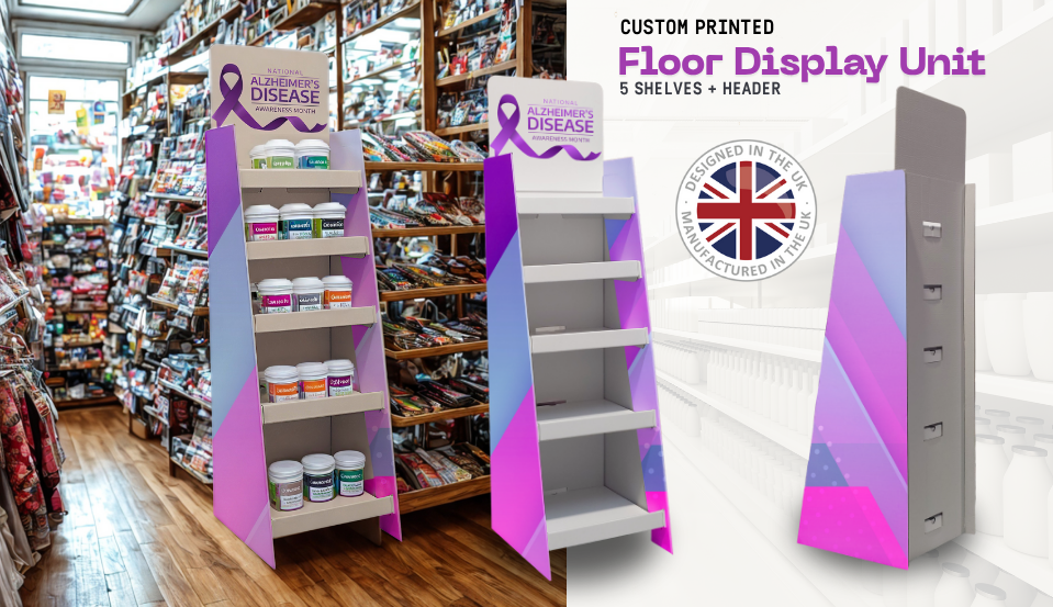 Custom PRINTED Cardboard Shop Floor Stand Display 4 Shelf Unit FSDU